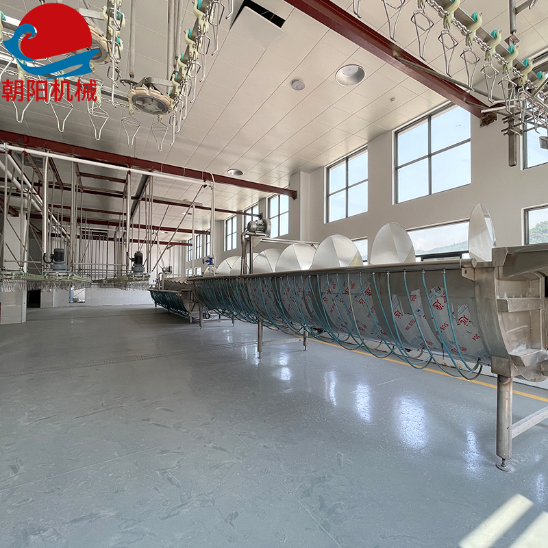 3)活雞麻電通常采用水浴式麻電,麻電電壓:70-90v,麻電時間:2-3s。或不通過麻電工序,采用毛雞上掛后通過高架輸送線自動輸送1min,讓毛雞平靜下來后再刺殺。