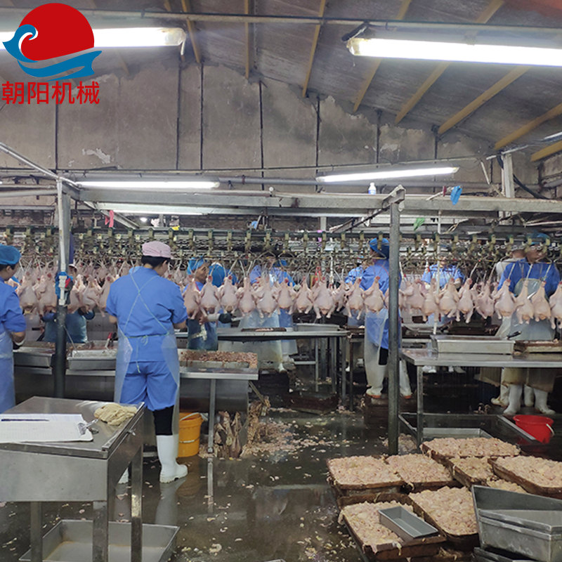 注:產(chǎn)品不同,工藝流程有差距。諸城市朝陽(yáng)機(jī)械有限公司是一家集家禽屠宰設(shè)備、家禽屠宰流水線研發(fā)生產(chǎn)和設(shè)計(jì)銷(xiāo)售于一體的生產(chǎn)制造商。公司具有較完善的設(shè)計(jì)、研發(fā)、檢測(cè)和售后體系,并且具有雄厚的技術(shù)力量,進(jìn)步的工藝設(shè)計(jì)水平、屠宰設(shè)備和安裝水平,是國(guó)內(nèi)家禽屠宰機(jī)械行業(yè)代表性企業(yè)。公司長(zhǎng)期與國(guó)內(nèi)外屠宰加工企業(yè)合作,走引進(jìn)——消化——?jiǎng)?chuàng)新和自主研發(fā)相結(jié)合的道路,在國(guó)內(nèi)外同類產(chǎn)品的基礎(chǔ)上,不斷更新和改造。公司主要設(shè)備有:A字型立式脫毛機(jī)、臥式脫毛機(jī)、強(qiáng)力噴淋機(jī)、松毛機(jī)、浸燙池、螺旋預(yù)冷機(jī)、禽籠清洗機(jī)、電暈機(jī)、兔扯皮機(jī)、兔割前爪/后爪機(jī)、剝胗機(jī)、自動(dòng)洗鉤機(jī)、螺旋燙爪機(jī)、雞爪脫皮機(jī)、分割輸送帶等屠宰用設(shè)備。其中,公司獨(dú)力發(fā)明生產(chǎn)設(shè)計(jì)的“電動(dòng)調(diào)節(jié)脫毛機(jī)”及“自動(dòng)控水控溫浸燙池”順利通過(guò)知識(shí)產(chǎn)權(quán)局的實(shí)質(zhì)性審查。公司所生產(chǎn)的設(shè)備性能達(dá)到國(guó)際同類產(chǎn)品水平,處于國(guó)內(nèi)超前地位,可與國(guó)外同類產(chǎn)品配套使用,設(shè)備遠(yuǎn)銷(xiāo)阿爾及利亞、澳大利亞等中東、非州等并建立了長(zhǎng)期穩(wěn)定的合作關(guān)系。